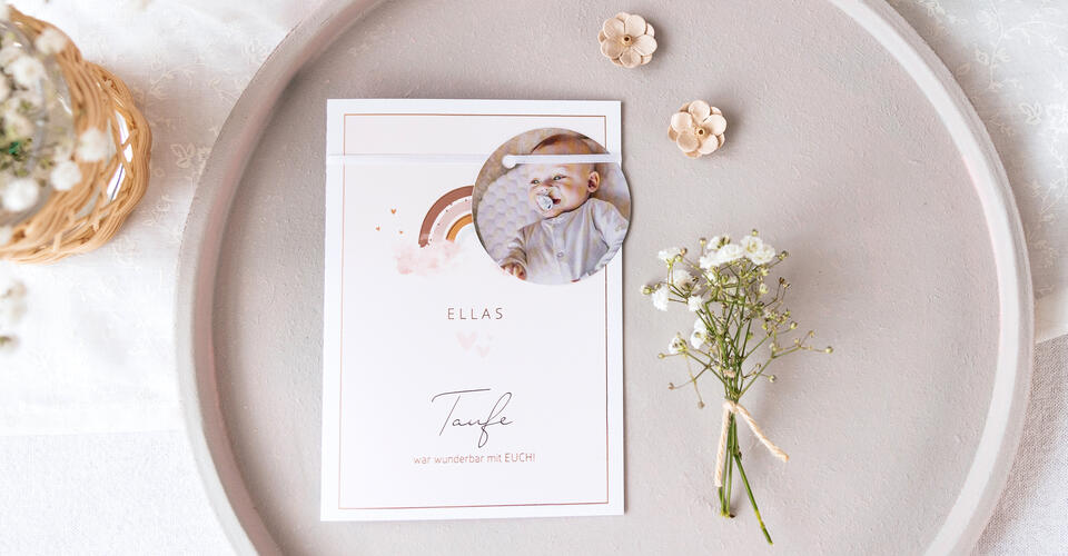 Überrasche Deine Gäste neben der Danksagung zur Taufe mit einem kleinen Geschenk oder verschicke zauberhafte Bilderboxen als Erinnerung an die Tauffeier.
