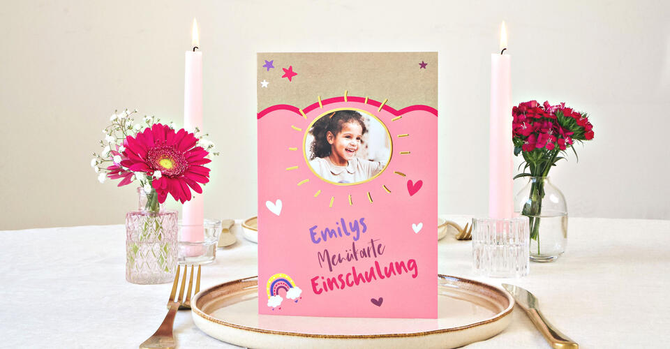 Coole Superhelden, süße Zuckertüten, kunterbunte Regenbögen: Lass Dich von unseren originellen Motiven inspirieren und gestalte online die perfekten Speise- und Getränkekarten für die Einschulungsfeier Deines Kindes.