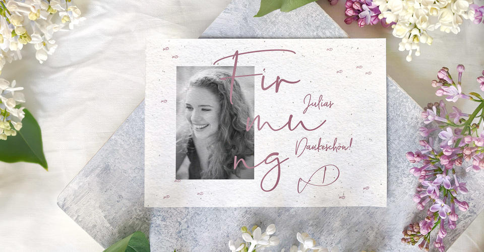 Mit Hilfe unseres Online-Konfigurators kreierst Du einfach und schnell einzigartige Dankeskarten zur Firmung. Nutze hierfür unsere kostenlosen Design- und Textvorlagen oder ersetze die vorhandenen Inhalte durch Deine eigenen. Füge noch die schönsten Fotos vom Firmkind sowie von der Feier hinzu, schon sind Deine Danksagungen zur Firmung fertig.