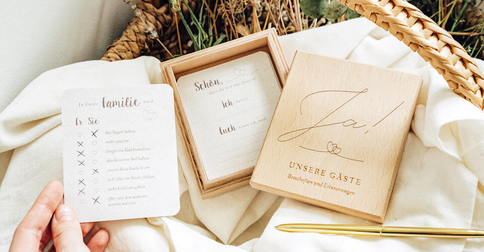 Entdeckt jetzt unsere hochwertigen Gästebuchkarten zur Hochzeit und wählt entweder den edlen Papierschuber oder die hochwertig gravierte Holzbox dazu aus.