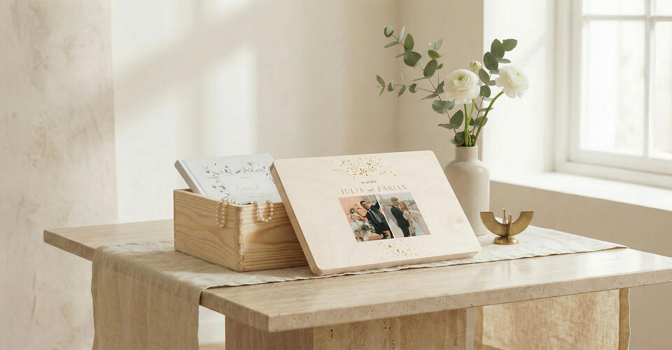 Verewigt Eure schönsten Hochzeitsmomente in traumhaft schönen Fotobüchern, auf stilvollen Wandbildern oder einzigartigen Fotoaufstellern. Ob als Erinnerung für Euch selbst oder als besonderes Dankeschön für Eure Gäste – entdeckt jetzt unsere vielfältigen personalisierbaren Papeterie-Produkte zur Hochzeit.