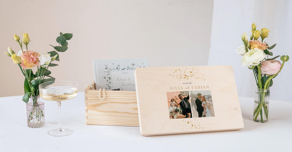 Bewahrt die schönsten Momente und Andenken an Eure Hochzeit in einer liebevoll gestalteten Erinnerungsbox für immer auf. Sucht Euch jetzt Euer Lieblingsdesign aus und erstellt online Eure individuelle Schatzkiste aus Birkenholz mit persönlichem Foto und Text.