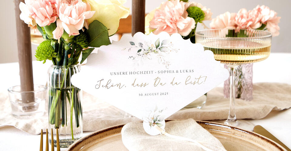 Neben dem Einsatz als Willkommensgruß für Deine Gäste lassen sich unsere Fächer auch mit nützlichen Infos zur Hochzeit gestalten – zum Beispiel mit dem {{block1}} Eurer Feier oder in Form eines Mini-Kirchenhefts mit dem Ablauf der Trauung. Ihr könnt sie beispielsweise auf den Kirchenbänken auslegen, in einem Körbchen am Eingang zum Festsaal bereitlegen oder von Euren Trauzeugen beim Empfang verteilen lassen. So wissen Eure Lieben jederzeit, was als Nächstes folgt, und können sich entspannt durch den Tag begleiten lassen.{{block2}}