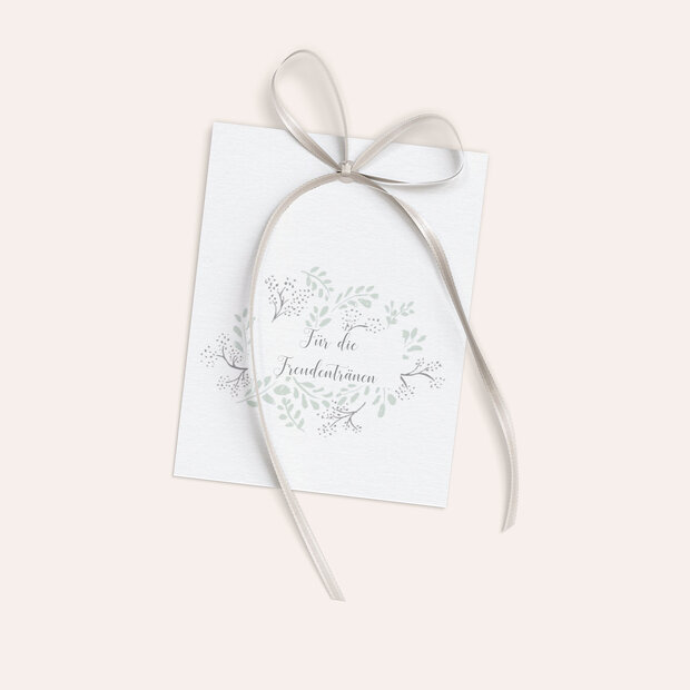 Zu jeder romantischen Traumhochzeit gehören Freudentränen. Legt für Eure Lieben ein Taschentuch mit personalisiertem Anhänger auf den Platz. Einige werden das Taschentuch bei der Trauung ganz sicher nutzen. Andere nehmen dieses kleine Geschenk gern als schönes Andenken mit nach Hause.