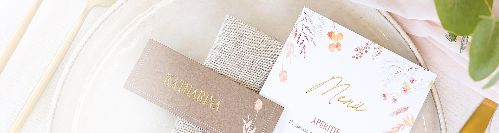 Die Einladungskarten sind versendet und wahrscheinlich kennt Ihr bereits die Anzahl Eurer Gäste. Nun ist es an der Zeit, sich Gedanken über die passende Papeterie für Euer Hochzeitsfest zu machen. Hier findet Ihr kreative Produktideen für eine zauberhafte Dekoration Eurer Location – natürlich jederzeit im Design-Set wählbar, wenn Ihr es wünscht.