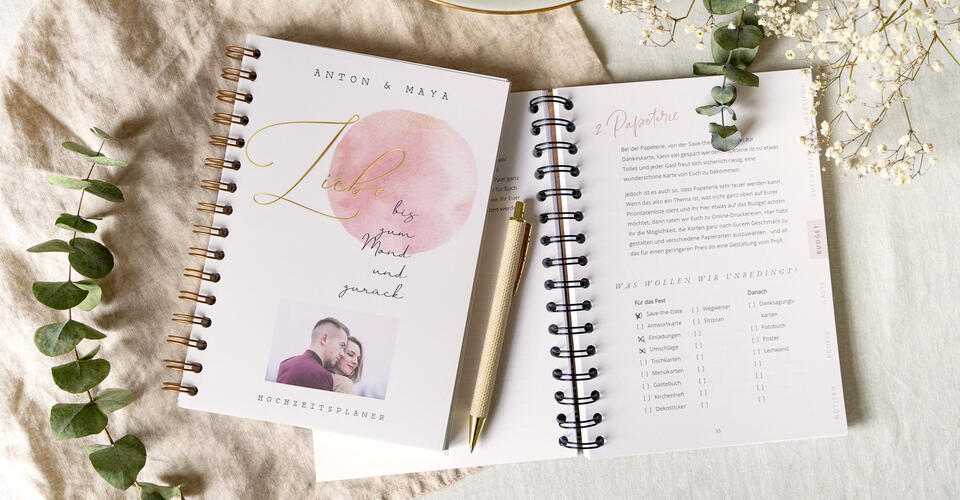 Im Hochzeitsplaner findet Ihr neben Anregungen und Tipps auch viel Platz für eigene Notizen. Sollten diese Seiten nicht ausreichen, könnt Ihr zusätzlich Notiz- und Skizzenbücher sowie Terminplaner bei uns bestellen. Bei diesen lässt sich das Deckblatt ebenfalls mit Eurem Foto und Text umsetzen.