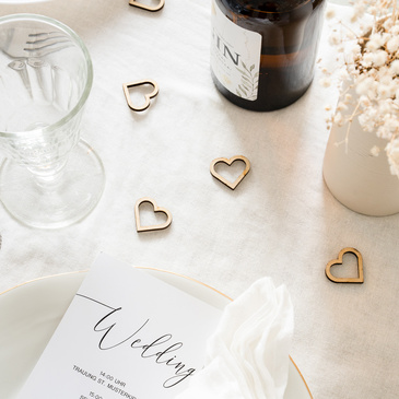 Der natürliche Charme von Holz macht aus Deiner Raum-, Tisch- und Tortendekoration einen echten Blickfang. Filigrane Schriftzüge als Wegweiser sowie im Blumenarrangement eingebundene Holz-Cake Topper verleihen Deinem Fest einen modernen und eleganten Charakter.