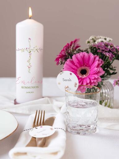 Stimme die Papeterie für die Kommunionfeier harmonisch auf die Kommunionkerze ab und dekoriere Deine Festtafel mit zauberhaften Menükarten, Tischkärtchen und Gastgeschenk-Aufklebern im egleichen Stil.