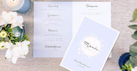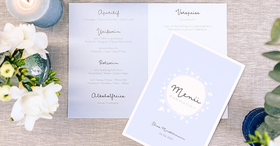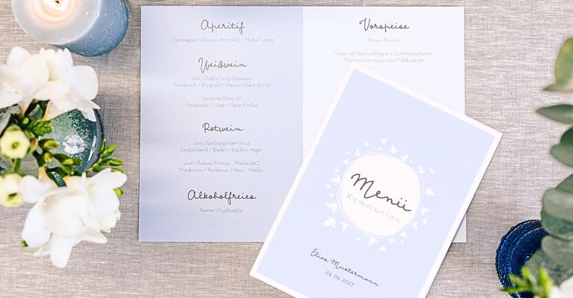 Wenn sich Familie und Freunde nach dem feierlichen Kommuniongottesdienst zum Festessen versammeln, dann verraten ihnen Deine eigens designten Menükarten geschmackvoll, auf welche Leckereien sie sich freuen dürfen. Wir unterstützen Dich bei der Erstellung Deiner Karten für das Kommunionmenü mit zahlreichen Gestaltungsoptionen, einem praktischen Online-Konfigurator und unserem kostenfreien Musterkarten-Service.