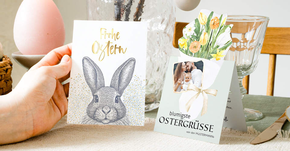In unserem Sortiment findest Du unterschiedliche Formate und Designs für Osterkarten. Vom klassischen Postkartenformat, über unsere Formkarten bis hin zu Transformationskarten mit Bastelanleitung ist alles dabei. Unsere Motivkarten mit Falt- oder Stanzoption kannst Du nach dem Zusammensetzen sogar als süße Tischdekoration für Deinen Osterbrunch verwenden.