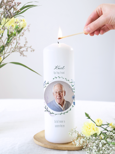 Ein geliebter Mensch oder treuer tierischer Gefährte ist von uns gegangen und wir empfinden tiefe Trauer über den Verlust. Eine Sterbekerze {{block1}} in dieser schweren Zeit und {{block2}}. Gestalte sie mit einem persönlichen Foto sowie wertschätzenden Spruch und kreiere damit ein Symbol der immerwährenden Verbundenheit.