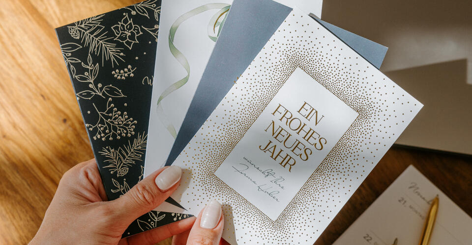 Für geschäftliche Weihnachtsgrüße solltet Ihr das Versanddatum so wählen, dass die Weihnachtskarten in den ersten beiden Adventswochen bei Euren Geschäftspartner:innen, Kund:innen und Mitarbeiter:innen ankommen.